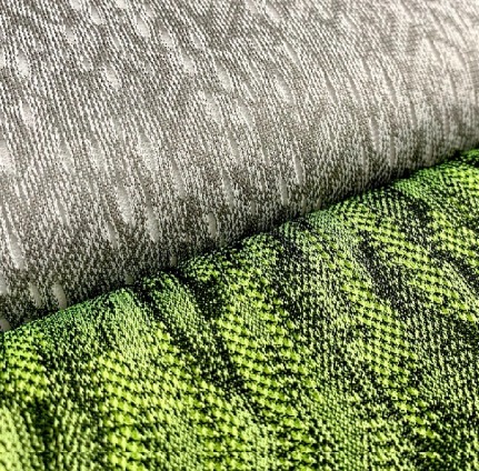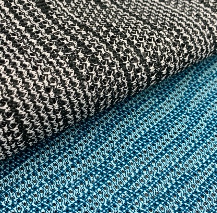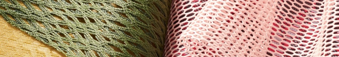 - 具有仿舊外觀的漸漬系列,透過一次性織造提花技術在布面同時呈現麻花、暈染、漸變效果,並延續經編特有的開孔結構達到良好透氣性