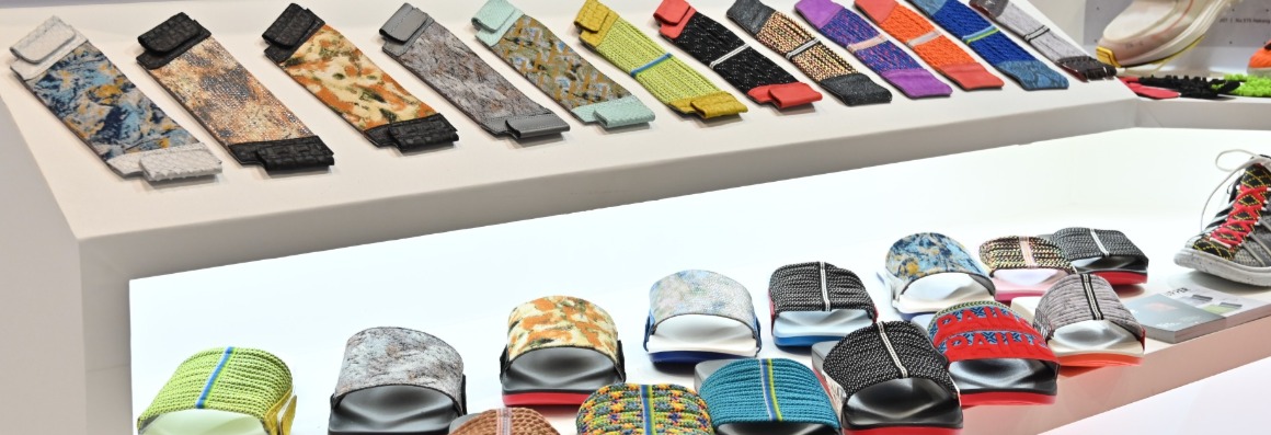 專為鞋類產品開發的多樣輔料如織帶、鬆緊帶、鞋帶、拉繩、反光材料等,超越您的想像;面料如針織經編提花布、及梭織提花布更是鞋面面料最新趨勢,透過客製化的一片式鞋面織造技術,可大量縮短製鞋工序以及增加設計豐富性。