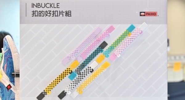 由走馬拉繩與緹花織帶於模具內埋入射出的雙色精緻尾扣,背貼百和專利 Easy Tape 貼而美射出勾。可應用於多種產品,如鞋身或配件扣合。
