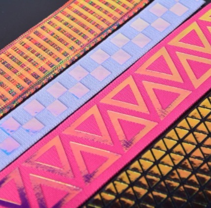 採用多層膜雷射切割幾何圖形,轉貼於百和鬆緊帶表面,多層膜圖樣在不同光線下產生不同光影效果。