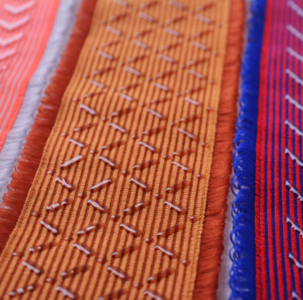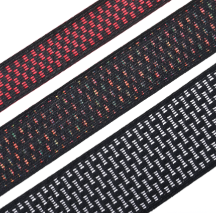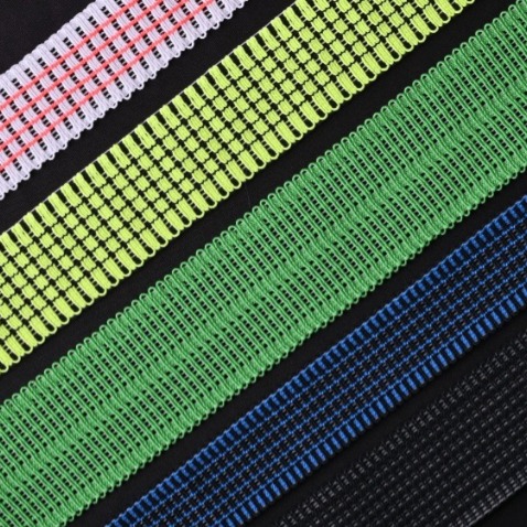 具彈性的針織鬆緊帶,可作多色提花圖樣,帶體延伸時可見網洞結構。