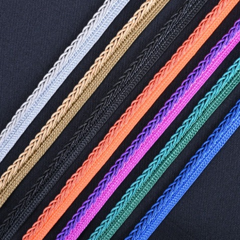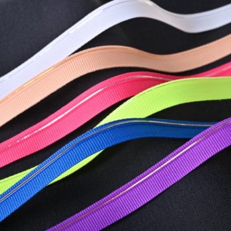 採用多色亮光紗包紗走馬編織而成的成衣用出芽子母帶,帶有亮澤感且內斂的帶身,適合各種成衣配件。